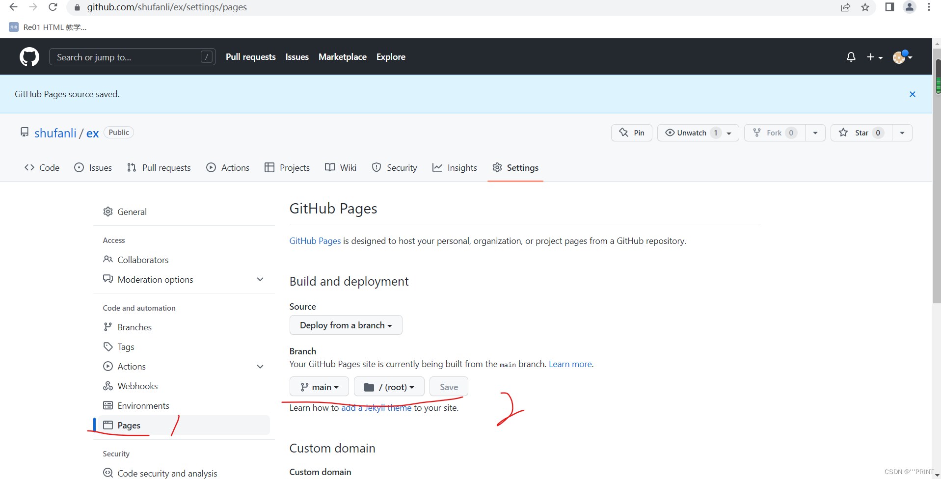 - 选择左侧pages菜单,source中选择分支选择main,点击save